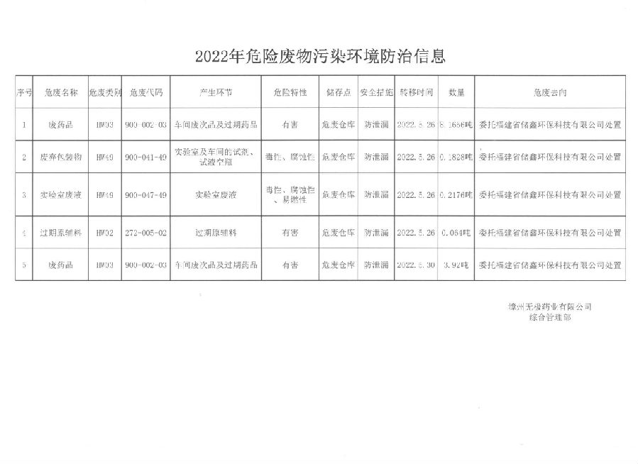 無極藥業(yè)有限公司2022年危險廢物污染環(huán)境防治信息