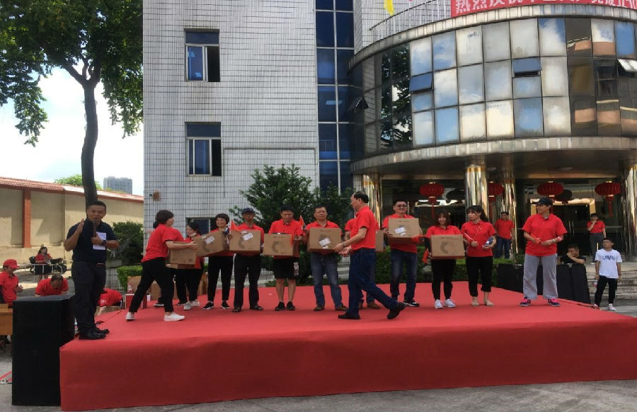 圖為領(lǐng)導(dǎo)為獲得第一名的團(tuán)隊頒發(fā)獎品